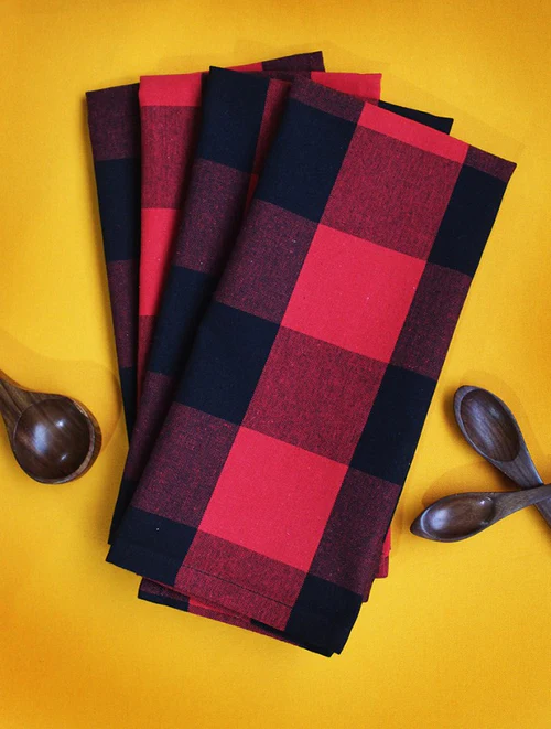 Checked is a pattern of modified stripes consisting of crossed horizontal and vertical lines forming squares. The checked pattern is a simple design that alternates multiple colors of Red Shades With black piping Kitchen Towels in the pack of 4 Pieces.
