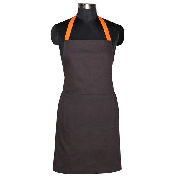 A Cotton Solid Black With Orange Straps is a protective piece of clothing made from cotton that covers the front of the body. Cooking Persons wear Aprons to protect Clothes from splashes and permanent stains. It is also worn as decoration by women. It acts as a bacterial shield and thus, chefs are always encouraged to wear an apron while cooking.