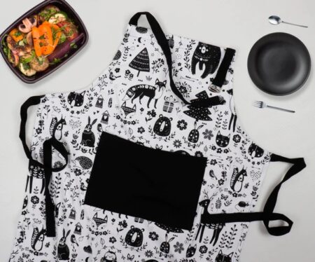 An Apron is a protective piece of clothing made from cotton that covers the front of the body. Cooking Persons wear Aprons to protect Clothes from splashes and permanent stains. It is also worn as decoration by women. It acts as a bacterial shield and thus, chefs are always encouraged to wear an apron while cooking.